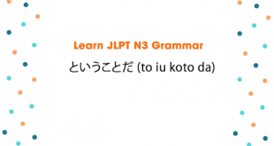 Learn JLPT N3 Grammar: ということだ (to iu koto da) Meaning: I heard; it means that; rumor has it that… How to use: Verb-dictionary form + ということだ Phrase + ということだ Noun + ということだ Example sentences: 1. 山田さんは近く会社をやめて留学刷るということだ。 Yamada-san wa chikaku kaisha o yamete ryūgaku suru to iu kotoda. I heard that …