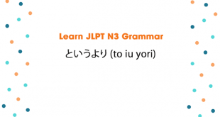 Learn JLPT N3 Grammar: というより (to iu yori) Meaning: rather than How to use: Verb-casual + というより(は) Noun + というより(は) いadj + というより(は) なadj + というより(は) Phrase + というより + Phrase Example sentences: 1. この絵本は、子供向けというより、むしろ、大人のために書かれたような作品だ。 kono ehon wa, kodomo-muke to iu yori, mushiro, otona no tame ni kaka reta yōna …